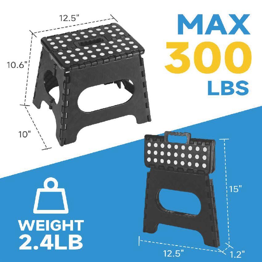 Features: Lightweight Design, Suitable for Both Children and Adults. One-Hand Operation: Convenient folding and storage design. High Weight Capacity: Supports up to 300lbs. Safe and Durable, Anti-slip and Rounded Corner Design. Versatile Use: Ideal for use in the kitchen, bedroom, bathroom, living room, office, garden, and outdoors, meeting a variety of daily needs. Product Information: Material: Plastic Color: White/Black Weight: 2.4LB Dimensions when opened (L*W*H): 9 x 10 x 12.5 inches Dimensions when folded (L*W*H): 13.5 x 1.2 x 12.5 inches Notice: 1. Please avoid placing the stool in environments with temperatures above 30? (86?) or below 5? (41?) for more than 5 hours. 2. Always use the step stool on dry, flat surfaces, and step in the center for optimal safety. 3. Regularly check for any wear and tear to ensure continued safe use.