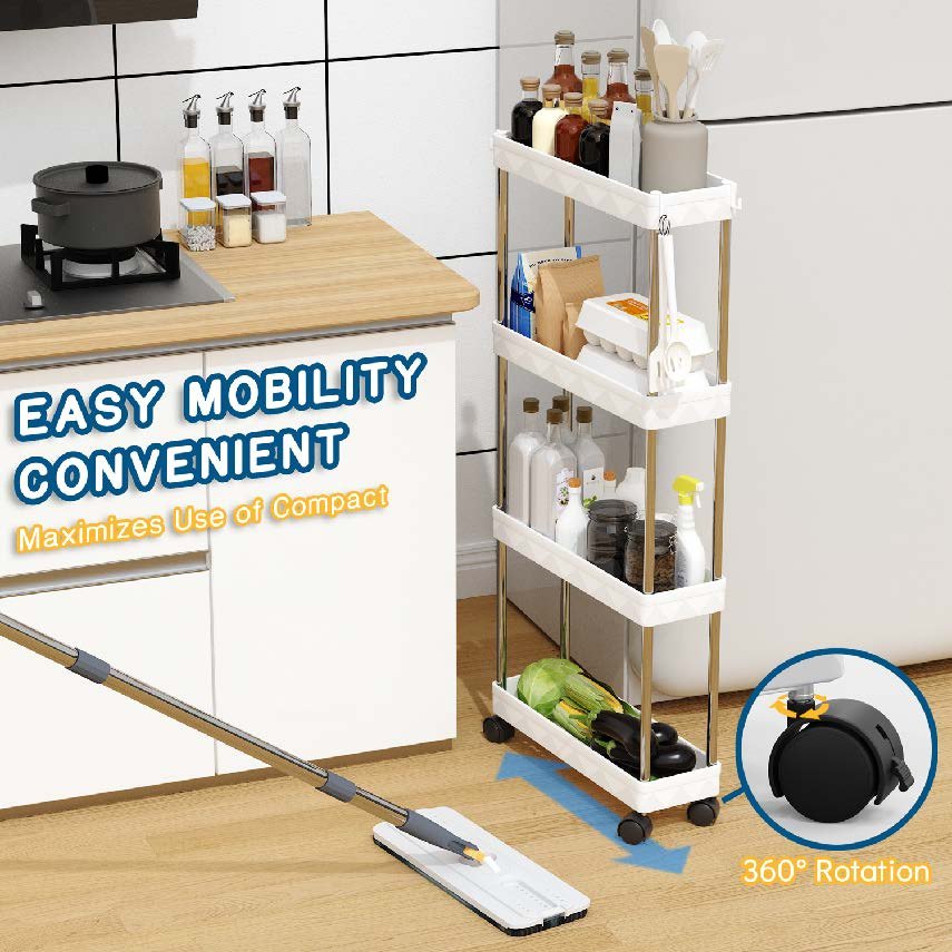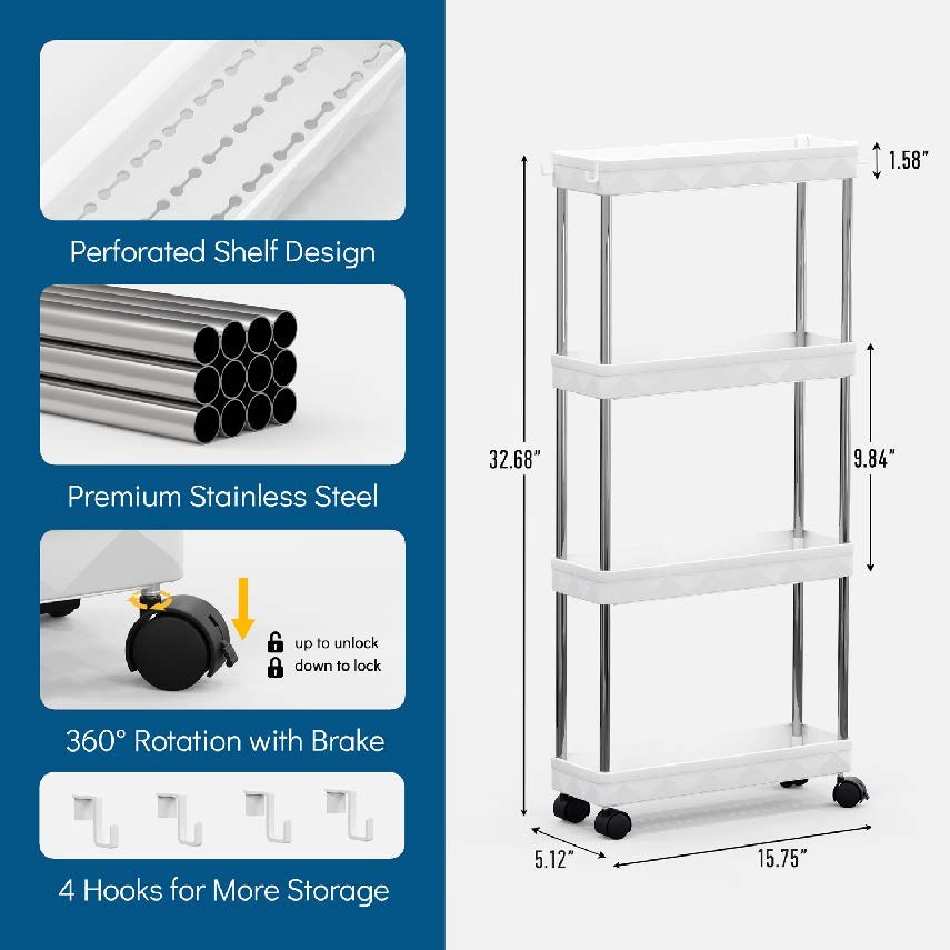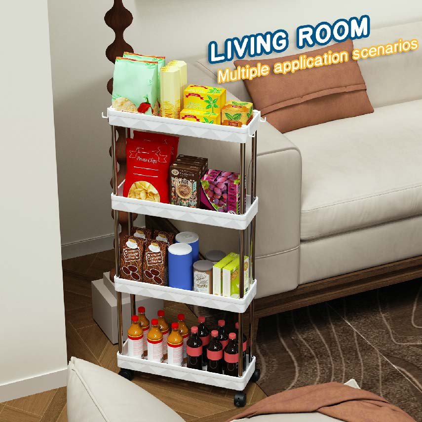 Slim Rolling Storage Cart 4 Tier, Bathroom Organizers and storage, Mobile bathroom Shelving Unit Utility, Suit for Office, Bathroom, Kitchen, Narrow Places & laundry room organization,White